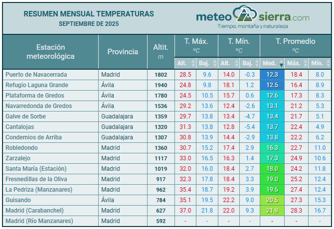 En las estaciones de montaña, como Puerto de Navacerrada, Refugio Laguna Grande o Plataforma de Gredos, las temperaturas promedio se han mantenido entre 12 y 13 °C, con máximas absolutas más moderadas (24°C en la Plataforma y la Laguna). A nivel de pueblos medias entre los 13,1ºC en Navarredonda y los 20,5ºC en Guisando, con máximas que han llegado a superar los 35ºC en alguna estación. También destacan las mínimas absolutas que se han producido, bastante frescas para la época. Tenemos heladas en Navacerrada, Navarredonda y los pueblos de Guadalajara, y mínimas por debajo de los 4ºC en los demás pueblos.