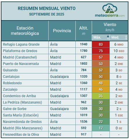 Para completar este resumen de septiembre de 2025 aquí se muestran las tablas con las principales variables meteorológicas. Solo se muestran las estaciones meteorológicas con más del 85% de los datos completos.