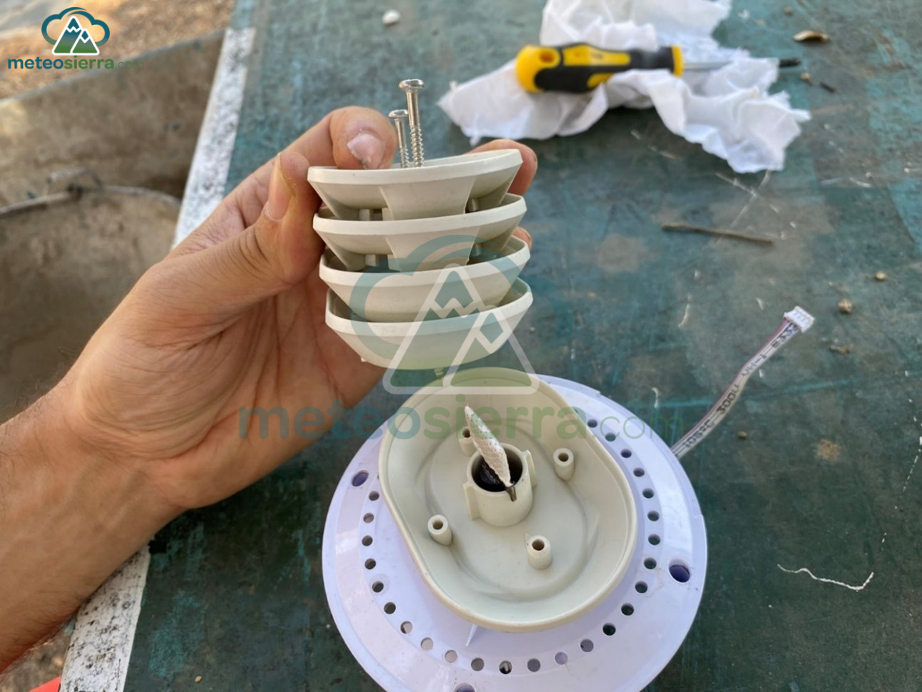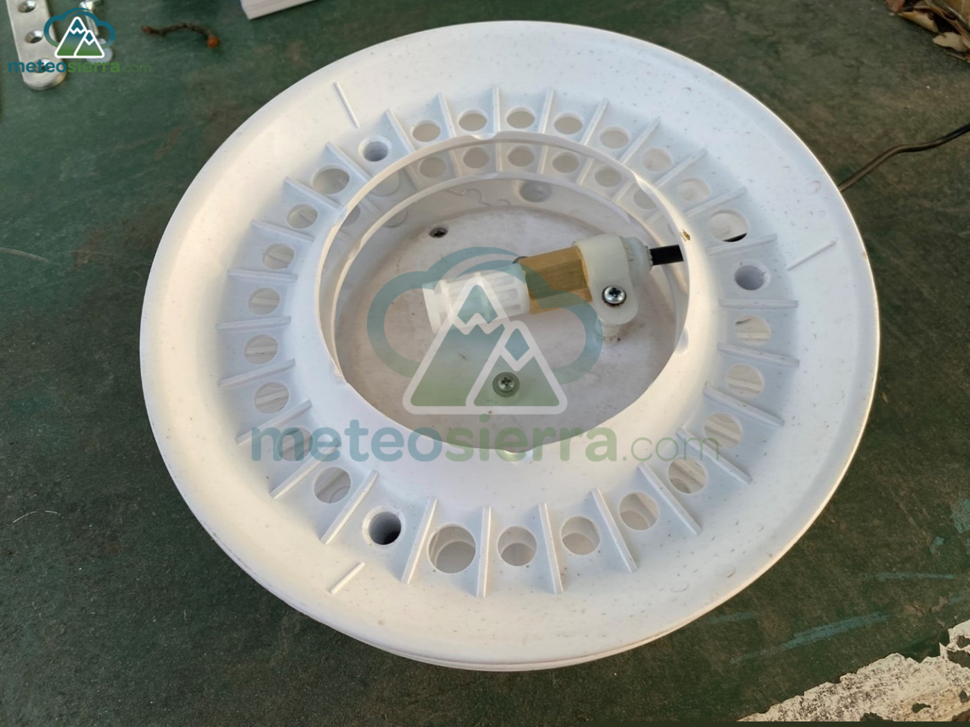 Garita fabricada con platos normales de plástico (ABS) y pintados con dos capas de color blanco brillante. Se han recortado los rebordes para no acumular el agua y tiene una forma bastante asimétrica, además de haber perdido algo de pintura. La separación entre los platos es de unos 2 cm, aunque muy irregular. Dentro de la garita se ha instalado un termómetro con sensor SHT30.