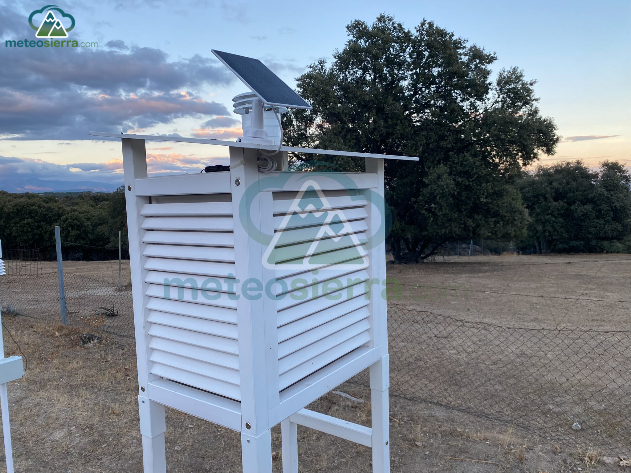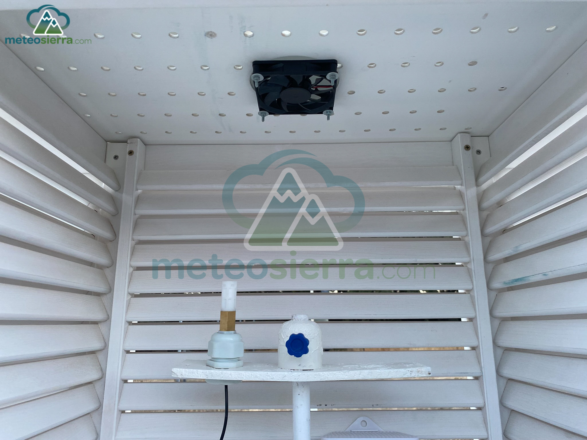 Abrigo meteorológico clásico utilizado globalmente para mediciones estándar y admitido por la OMM. Este modelo de Garita Stevenson tiene doble sistema de ventilación: mediante doble persiana y chimenea. Se encuentra aproximadamente en el rango medio de tamaños de las garitas Stevenson. En este caso, se ha añadido un ventilador con panel solar para mejorar la ventilación, e instalado un sensor SHT35.