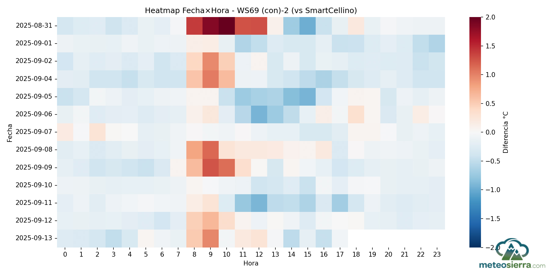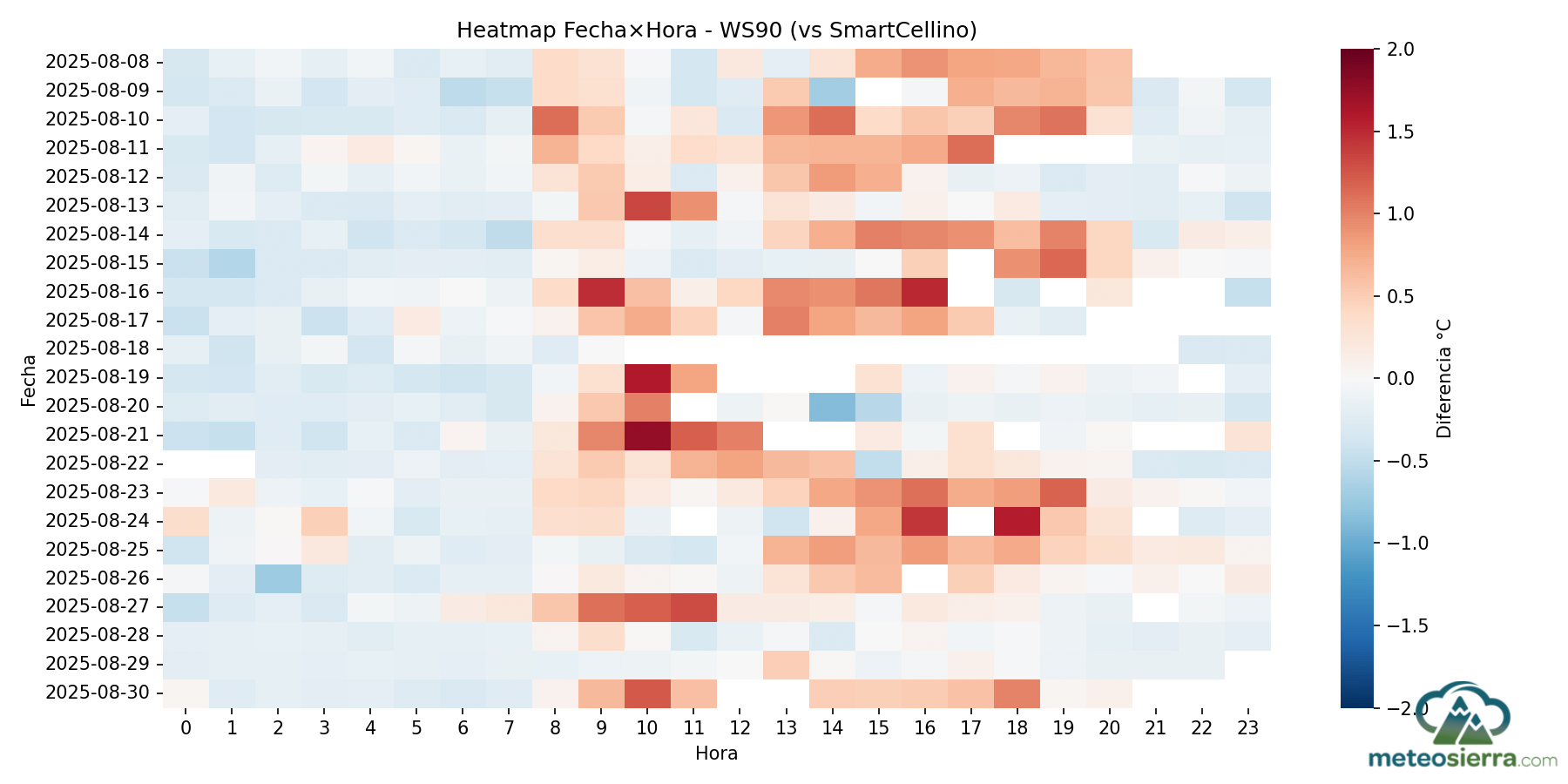 Los mapas de calor o heatmaps son una de las formas más intuituvas y visuales de analizar grandes volúmenes de datos meteorológicos. Estos gráficos permiten representar la información de forma bidimensional, donde el color indica la magnitud de la variable analizada, en este caso, la diferencia de temperatura de cada garita respecto a la estación de referencia, SmartCellino, a lo largo del tiempo.
