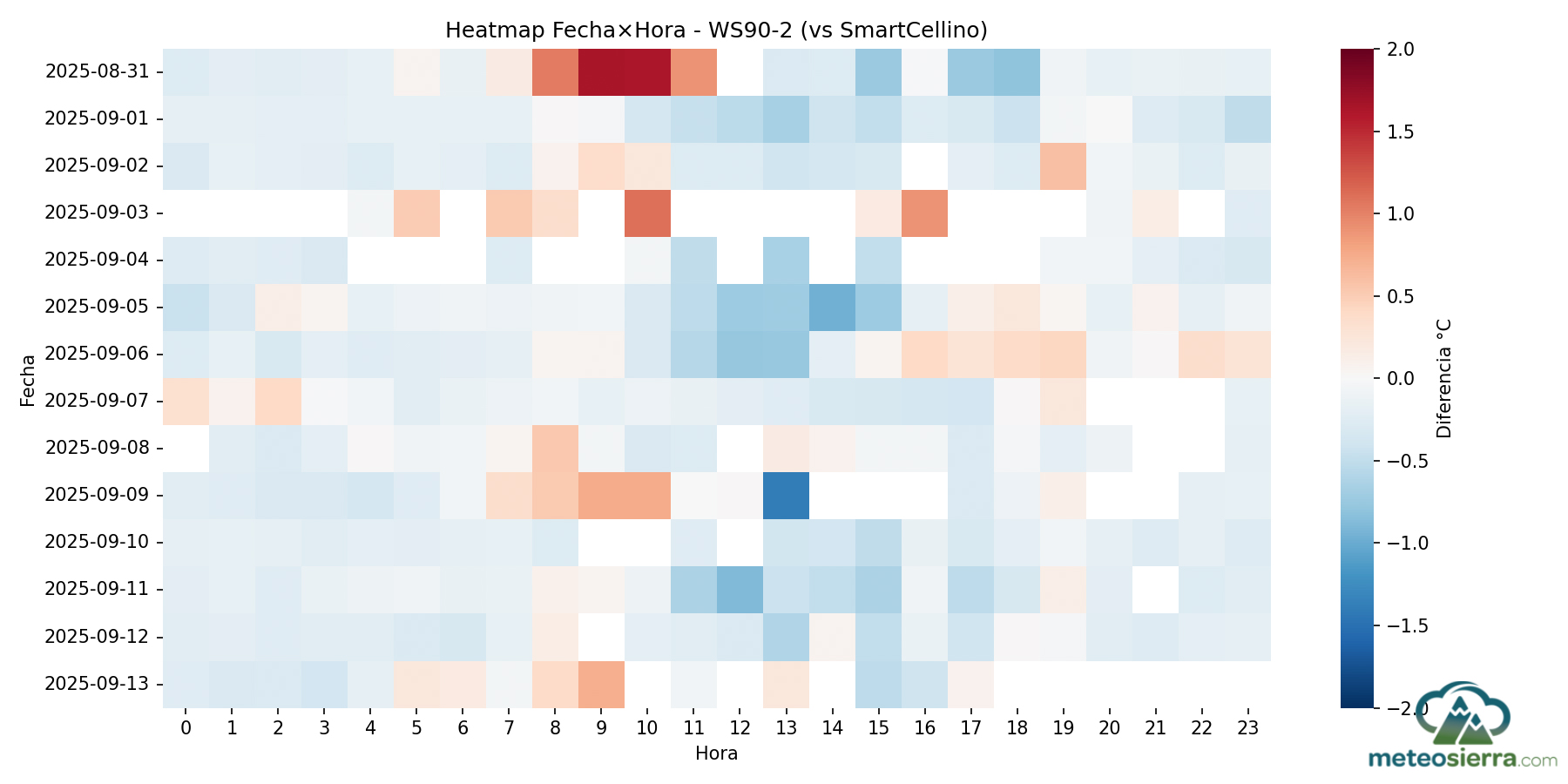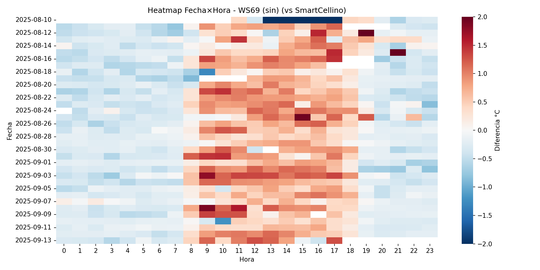 Estos mapas de calor resultan especialmente útiles para detectar patrones sistemáticos de comportamiento térmico. Por ejemplo, es habitual observar picos de sobrecalentamiento durante las horas centrales del día, cuando la radiación solar incide con mayor intensidad, y una tendencia a la estabilidad o incluso subestimación durante la noche. Asimismo, permiten identificar de un solo vistazo periodos anómalos o irregularidades, como días con mala ventilación, fallos en el sensor o episodios meteorológicos específicos, que podrían pasar desapercibidos en un análisis numérico tradicional.