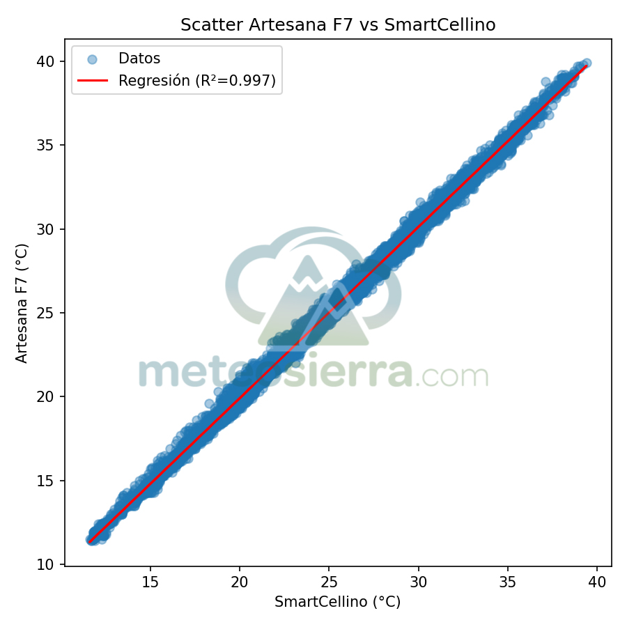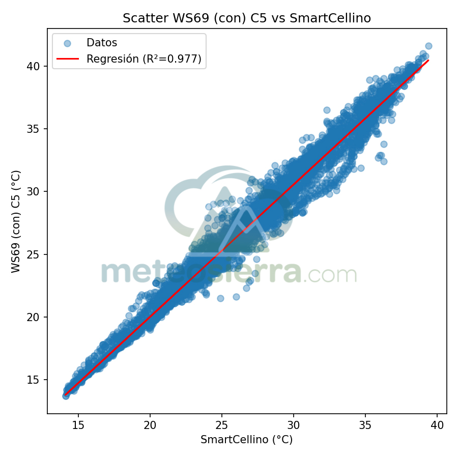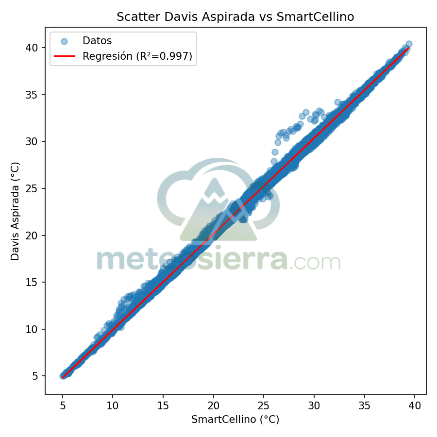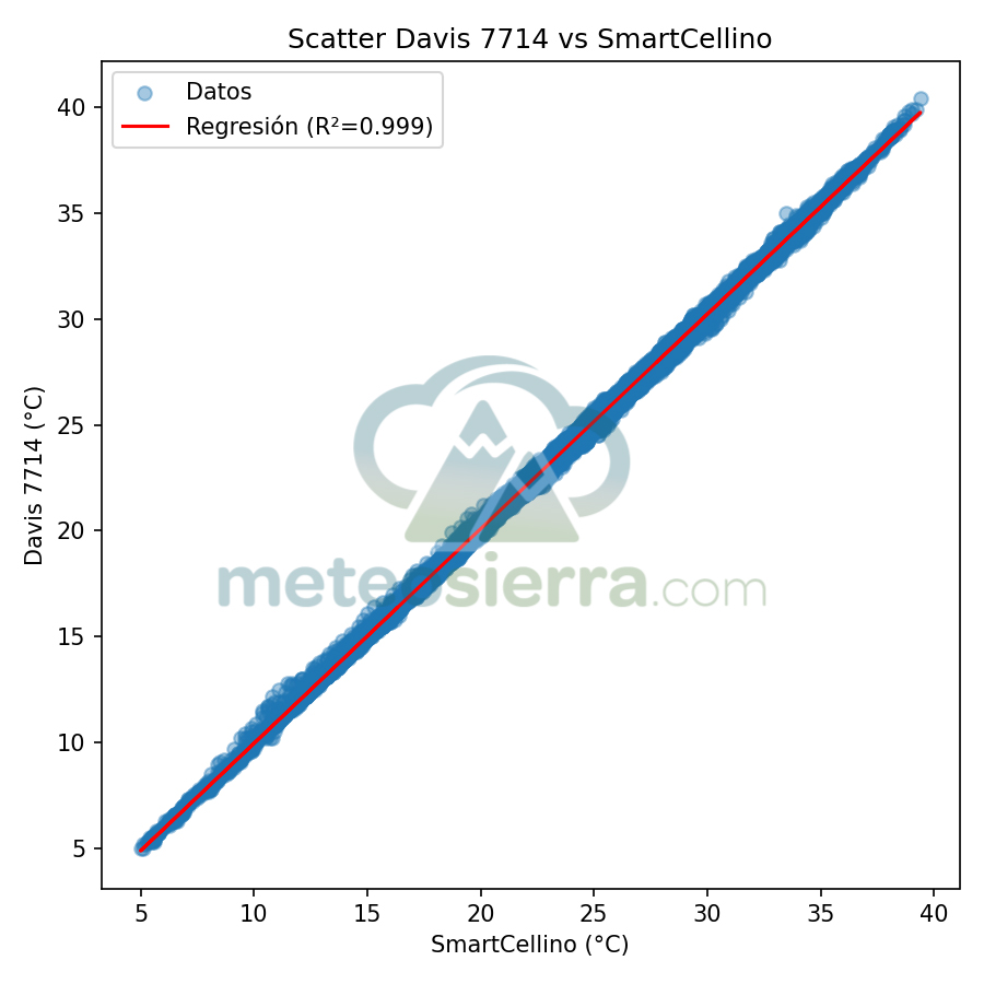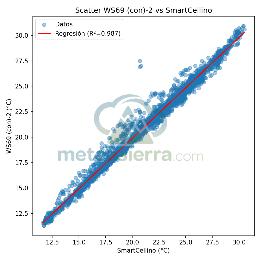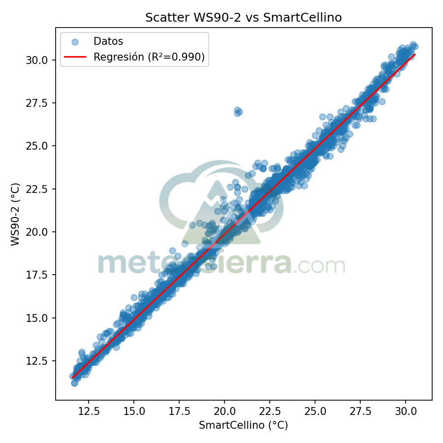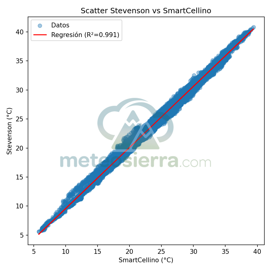 En estos gráficos se muestra en el eje de las x la temperatura de la garita de referencia y en el de las y la de la garita a comparar. Se incluye la línea de regresión y su coeficiente de determinación (R²), que indican cómo de bien se ajustan las mediciones de cada garita respecto a la referencia SmartCellino. Cuanto más alto es el valor de R² (cercano a 1), mayor es la correlación y precisión de la garita, ya que sus datos siguen fielmente las variaciones reales de temperatura. Una pendiente próxima a 1 y puntos alineados con la diagonal reflejan un comportamiento muy fiable, mientras que valores bajos de R² o una dispersión notable señalan errores o desviaciones en la respuesta de la garita, especialmente bajo condiciones extremas.