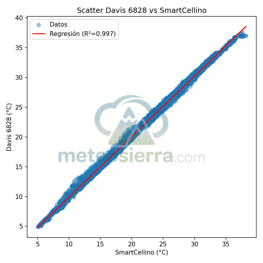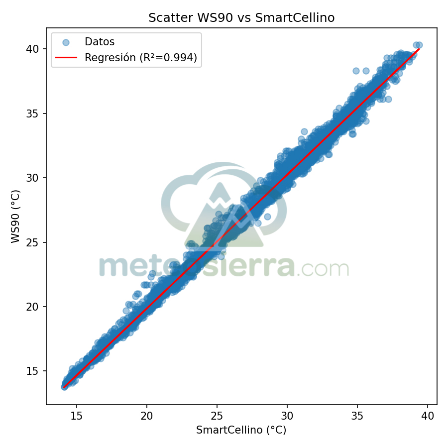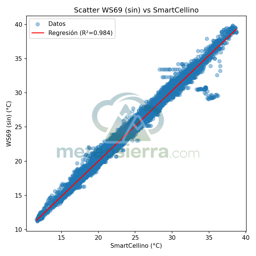 En este tipo de representación, cada punto del gráfico corresponde a una observación simultánea: la temperatura medida por la garita en el eje vertical frente a la medida de SmartCellino en el eje horizontal. Si una garita fuera completamente precisa, todos los puntos se situarían exactamente sobre la diagonal ideal, que representa la igualdad perfecta entre ambas mediciones. En este caso, la diagonal ideal no representa la temperatura perfecta, sino más bien la temperatura de nuestra garita de referencia.