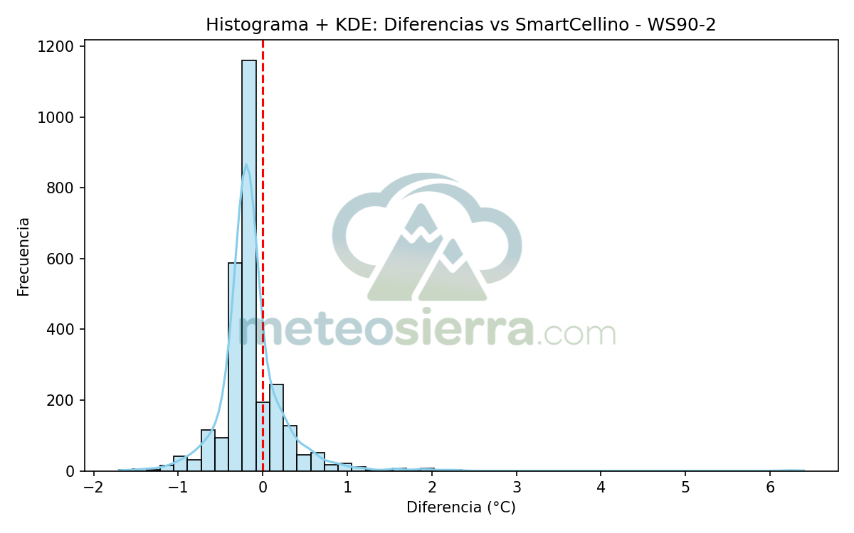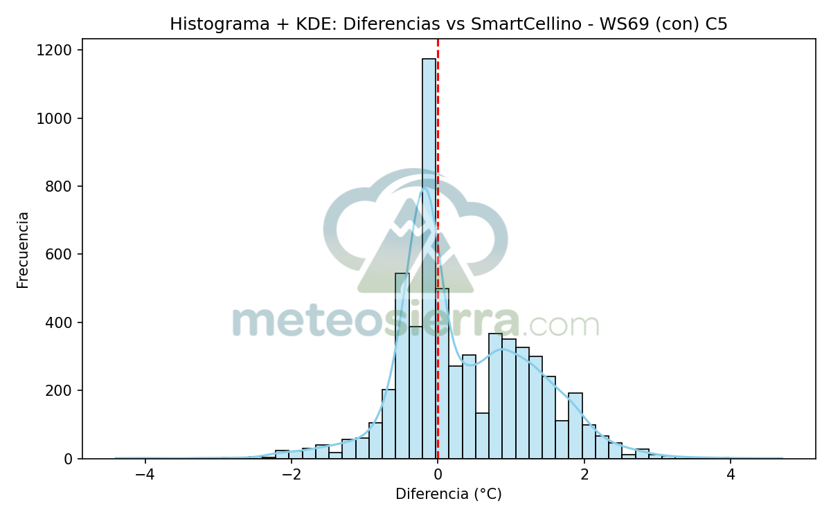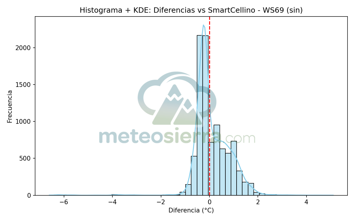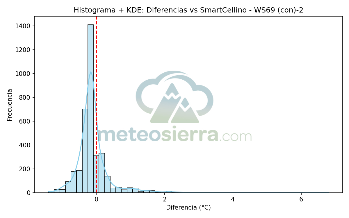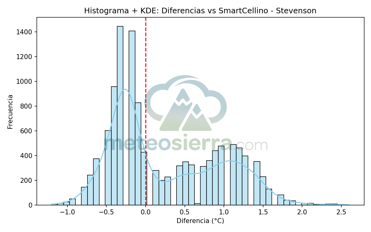 Los histogramas son una herramienta muy útil para visualizar la distribución de los errores de cada garita respecto a la referencia SmartCellino. En ellos se agrupan todas las diferencias de temperatura registradas durante el periodo de estudio, permitiendo observar de un solo vistazo cómo se comporta cada modelo frente a las condiciones reales.